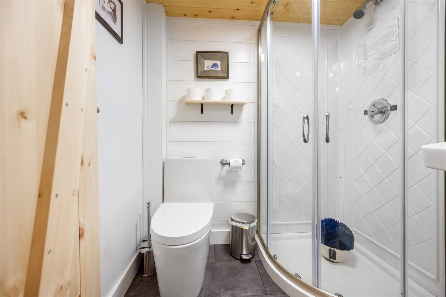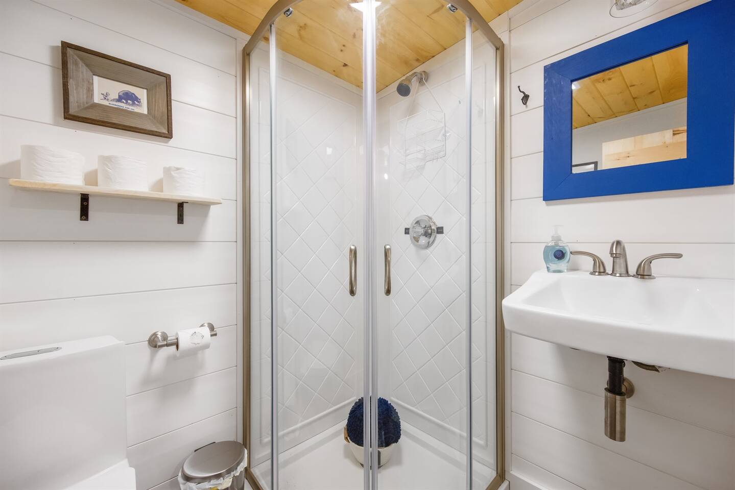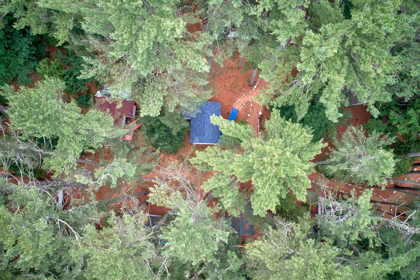 This newly remodeled Maine & Blueberry themed tiny cabin is nestled among the tall pine tree shoreline of Toddy Pond. The cabin is located in the back row of cabins, as seen on the map in the listing images. You will love this Blueberry themed tiny cabin! Tucked away in a 9-cabin resort on the beautiful gravel shores of Toddy Pond, you’ll have the opportunity to swim and kayak in the crystal-clear water, relax at the shady picnic tables beneath the towering pine trees, view local wildlife, enjoy at-home necessities, and easily access nearby towns! This is truly a special and unforgettable place! Bring your pets, we are very pet-friendly. You can escape the heat and cold in the cabin with the brand new central air conditioning and heating units. This tiny cabin is 14x14ft wide and has one main room, a bathroom, a screened-in porch, and a yard. There is a King-size bed, a kitchenette, and a small dining area with two chairs. There is an attached and fully remodeled bathroom. The bathroom is small but equipped! Brand-new stand-up shower, toilet, and vanity. Out the front door is a marvelous screened porch with another dining table. Outside is a 6 ft picnic table, a fire pit, a gas grill, and plenty of Adirondack chairs for your group. LINENS: We provide sheets, quilts, pillows, towels, hand towels, face towels, and beach towels CONSUMABLES: We provide salt, pepper, oil, paper towels, toilet paper, dish soap, and hand soap. We ask that people bring their own personal hygiene products to their preferences (shampoo, conditioner, body soap, toothpaste, etc) SLEEPING ACCOMMODATIONS: 1 King Bed, 1 pack and play available KITCHEN: Fully equipped, electric cooktop and oven, mini fridge, microwave, toaster, drip coffee maker, cooking basics, dishware, utensils INDOOR LIVING: Furnished bed areas, a small dining area consisting of a wooden table and two chairs PORCH: Dining table with two chairs OUTDOOR LIVING: Direct lake access via steep path and staircase to the water, private & expansive yard, fire pit for outdoor campfires (bring your own firewood), a gas grill, 6ft picnic table, Adirondack chairs, beautiful towering pine trees, abundant open space, ample sun and shade GENERAL: High-speed WiFi, new heat-pump A/C and heat unit, hot shower, keyless keypad entry, linens, towels PARKING: There is a large, shared gravel driveway. One vehicle is permitted for the Blueberry cabin. Parking is not directly next to the cabin. There is a spot to park and unload 50 feet from the cabin. From there, vehicles are moved to the parking lot, which is about 100 feet away. It is a steep hill down to the cabin from the unloading spot ACCESSIBILITY: The resort is not the most accessible place for anyone with mobility challenges. There are no stairs to access the building from the path or inside the building. However, parking is ~100 feet from the cabin entrance with a downhill slope from the driveway to the cabin door. This is one of the more accessible cabins, but does still require a walk downhill to get to the entrance ramp. PETS: We are pet-friendly! We have simple pet rules: clean up after your pet (inside and outside the cabin), keep your pet leashed while outside at all times to avoid any issues with other pets, and do not leave pets alone in the cabins