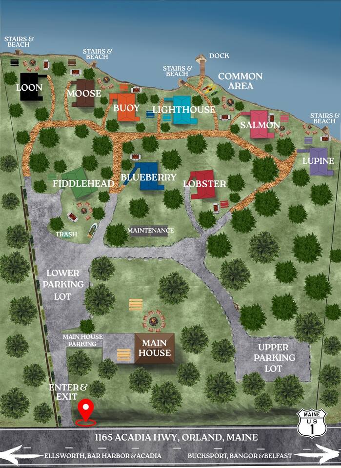 Tiny lakeside stay for those seeking outdoor adventures at Acadia NP, a relaxing lake trip, or a true historic Maine cabin resort experience. Includes WiFi, kayaks, a gas grill, central A/C and heat, a picnic table, Adirondack chairs, and a fire pit. Stay; a spacious waterfront, in the shade of a towering pine tree grove, you can grill, swim, kayak, fish, or enjoy a fire with a view. Explore; the cabin’s location is convenient to Bucksport, Ellsworth, Bangor, and Bar Harbor! Pet friendly.