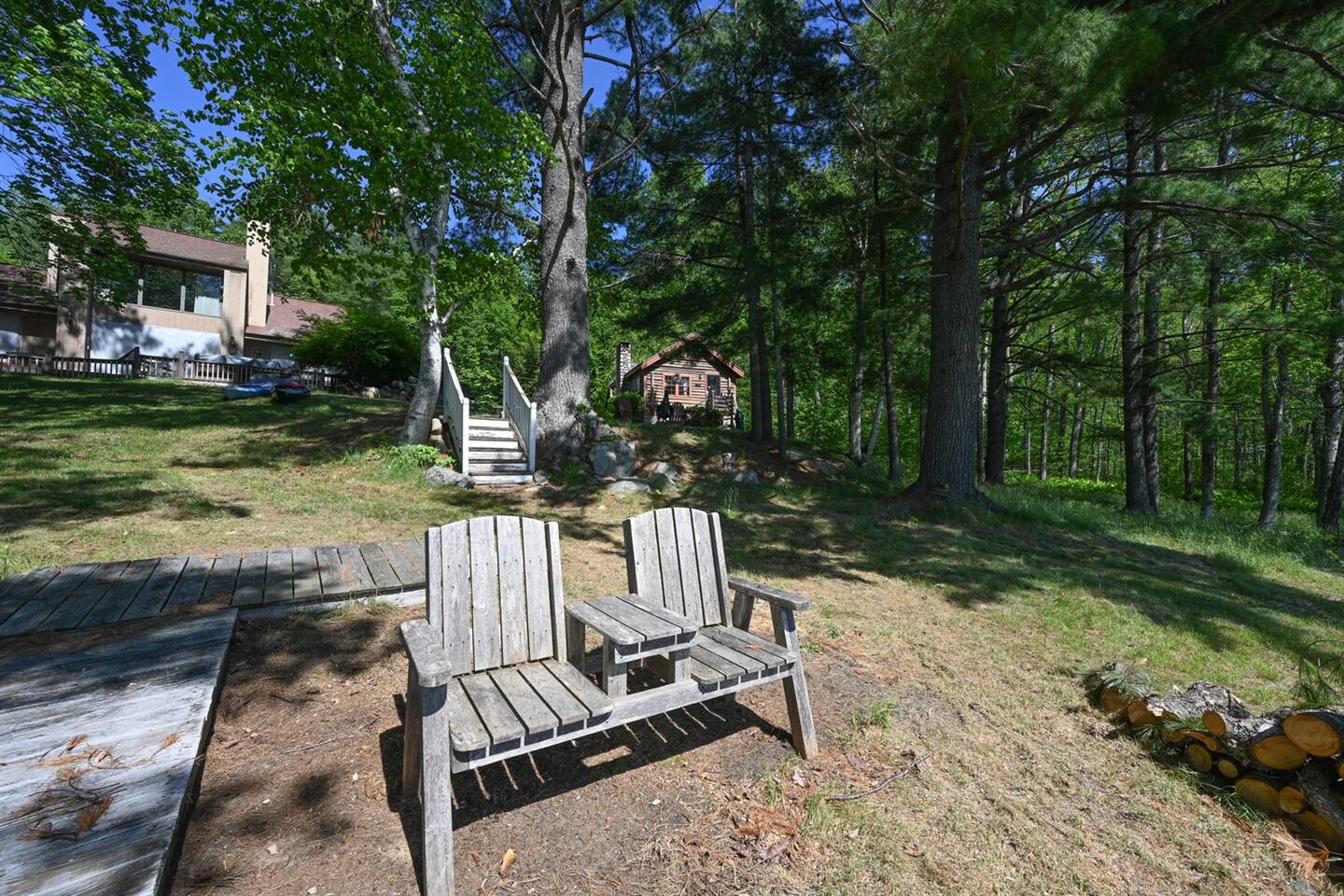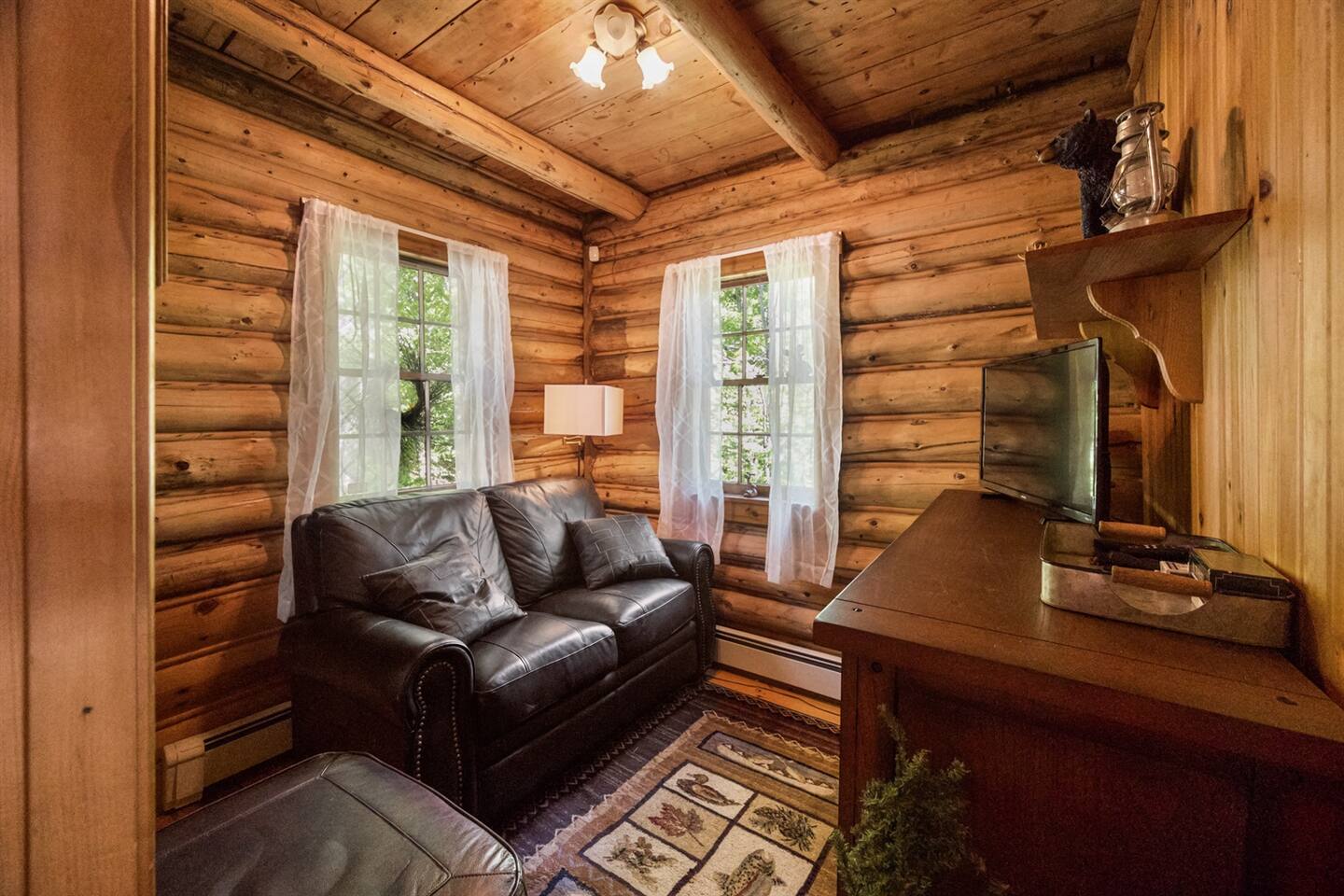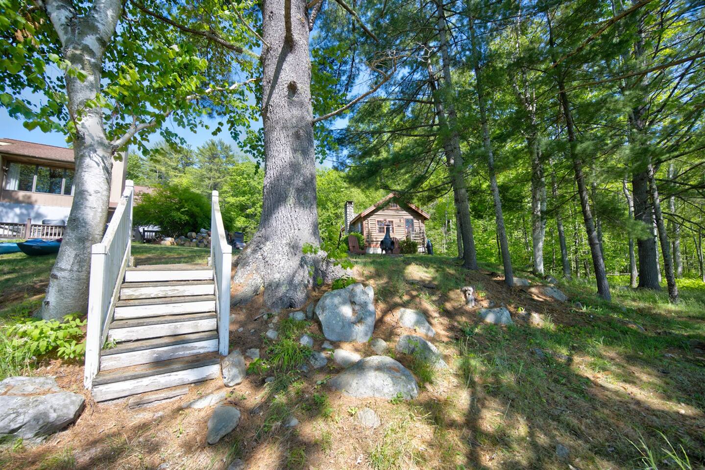 The cabin consists of one Main Room, a bathroom and a living room. The Main Room has the bed, dining area and kitchenette. The ladder for the loft is in the Main Room and access to the loft is there as well. The loft is open to below and not a private room from the Main Room. Bed: 1 King Bed Loft: 2 Twin Airmattress Beds Living room: Couch and TV KITCHEN: Fully equipped, electric cooktop stove, full-sized fridge, microwave, toaster oven, drip coffee maker, tea kettle, cooking basics, dishware, utensils INDOOR LIVING: Furnished living areas, comfy couch, small flat-screen Smart TV, small dining table, rocking chair OUTDOOR LIVING: Direct lake access, private & expansive yard, chiminea for outdoor campfires (bring your own firewood), wooden Adirondack chairs, lounge chairs, beautiful towering pine trees, abundant open space, ample sun and shade GENERAL: Standard WiFi, linens, towels, window A/C units, hot water baseboard heat, lockbox with key PARKING: Large paved driveway (4 vehicles) ACCESSIBILITY: There are stairs to access the building from the driveway (5 normal steps and 1 big step). The bed, bathroom, kitchen area, dining area, and living room are all on the first floor. The Loft is accessible by ladder.