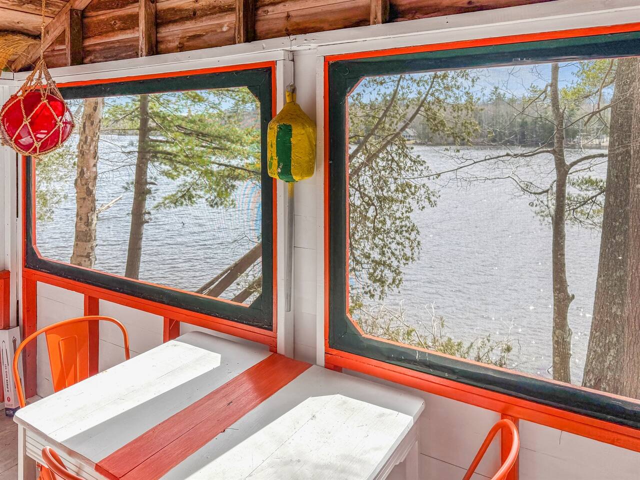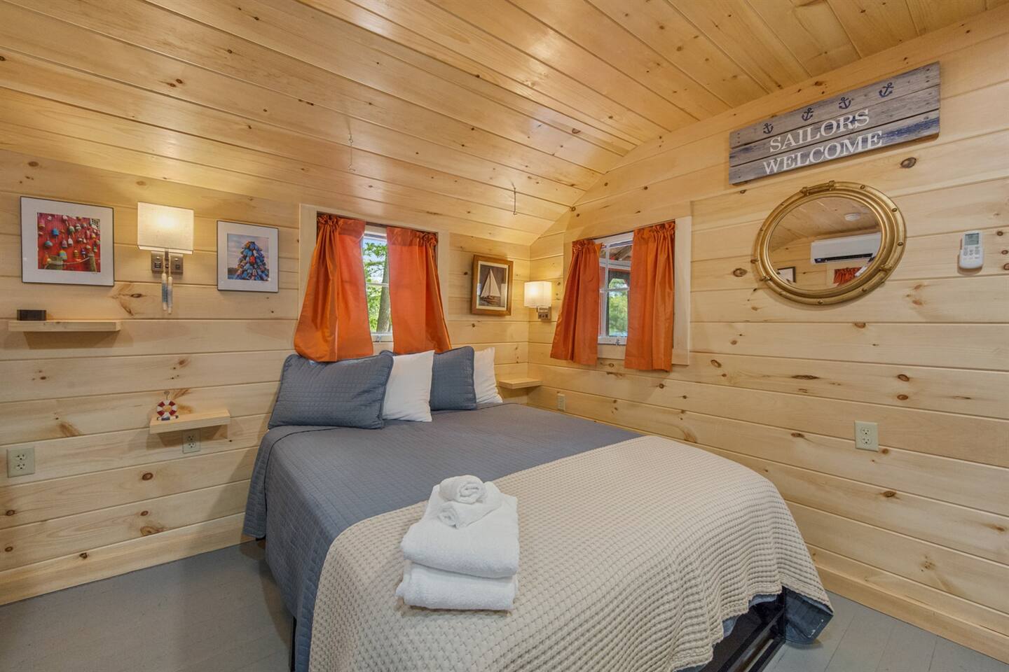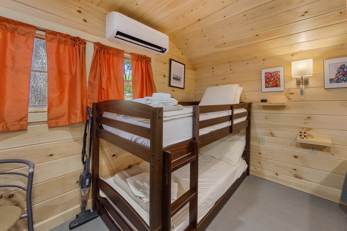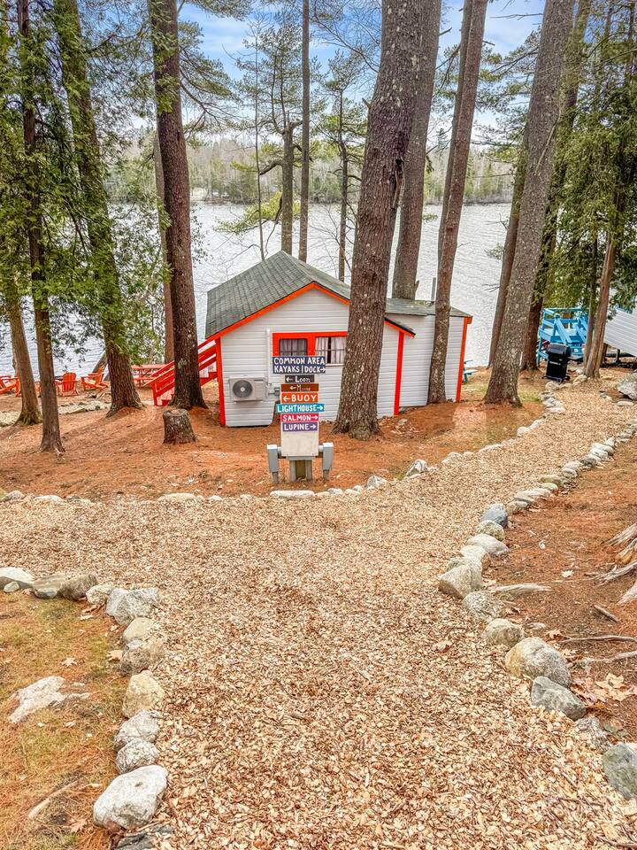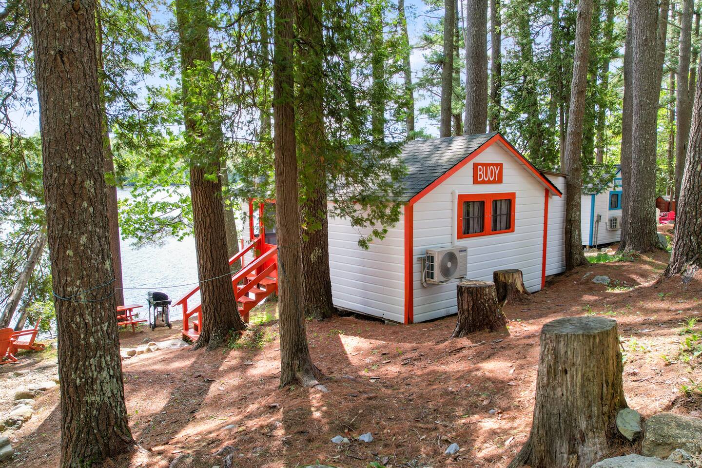 This newly remodeled Maine & Buoy themed tiny cabin is nestled among the tall pine tree shoreline of Toddy Pond. The cabin is located in the waterfront row of cabins, as seen on the map in the listing images. You will love this Buoy themed tiny cabin! Tucked away in a 9-cabin resort on the beautiful gravel shores of Toddy Pond, you’ll have the opportunity to swim and kayak in the crystal-clear water, relax at the shady picnic tables beneath the towering pine trees, view local wildlife, enjoy at-home necessities, and easily access nearby towns! This is truly a special and unforgettable place! Bring your pets, we are very pet-friendly. You can escape the heat and cold in the cabin with the brand new central air conditioning and heating units. This tiny cabin is 14x14ft wide and has one main room, a bathroom, a screened-in porch, and a yard. On one side, there is a queen-size bed and a bunk bed. A kitchenette and a small dining area with two chairs are on the other wall of the cabin. There is an attached and fully remodeled bathroom. The bathroom is small but equipped! Brand-new stand-up shower, toilet, and vanity. Out the front door is a marvelous screened porch with another dining table. Outside is a 6 ft picnic table, a fire pit, a gas grill, and plenty of Adirondack chairs for your group. LINENS: We provide sheets, quilts, pillows, towels, hand towels, face towels, and beach towels CONSUMABLES: We provide salt, pepper, oil, paper towels, toilet paper, dish soap, and hand soap. We ask that people bring their own personal hygiene products to their preferences (shampoo, conditioner, body soap, toothpaste, etc) SLEEPING ACCOMMODATIONS: 1 Queen Bed, 2 twin beds (bunks) KITCHEN: Fully equipped, electric cooktop and oven, mini fridge, microwave, toaster, drip coffee maker, cooking basics, dishware, utensils INDOOR LIVING: Furnished bed areas, a small dining area consisting of a wooden table and two chairs PORCH: Dining table with two chairs OUTDOOR LIVING: Direct lake access via steep path and staircase to the water, private & expansive yard, fire pit for outdoor campfires (bring your own firewood), a gas grill, 6ft picnic table, Adirondack chairs, beautiful towering pine trees, abundant open space, ample sun and shade GENERAL: High-speed WiFi, new heat-pump A/C and heat unit, hot shower, keyless keypad entry, linens, towels PARKING: There is a large, shared gravel driveway. One vehicle is permitted for the Buoy cabin. Parking is not directly next to the cabin. There is a spot to park and unload 50 feet from the cabin. From there, vehicles are moved to the parking lot, which is about 100 feet away. It is a steep hill down to the cabin from the unloading spot ACCESSIBILITY: The resort is not the most accessible place for anyone with mobility challenges. There are stairs to access the building from the path. Parking is on an incline, and there are stairs to the cabin entrance, with a downhill slope from the driveway to the cabin door PETS: We are pet-friendly! We have simple pet rules: clean up after your pet (inside and outside the cabin), keep your pet leashed while outside at all times to avoid any issues with other pets, and do not leave pets alone in the cabins